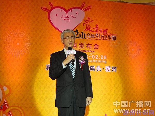 高雄观光局陈盛山局长介绍说,高雄有台湾最大的水岸灯会,包含国际级的港湾水舞烟火表演、高雄特色文化及国际艺术展演、各国特色灯区等,今年的高雄灯会将从二月十二日至二十八日止,总共有十七天,由于高雄市县合并,灯会主场除以光荣码头及爱河为主,还考虑延伸到冈山区河堤公园,他吁请大陆旅客春节、元宵节期间到高雄欣赏灯会。