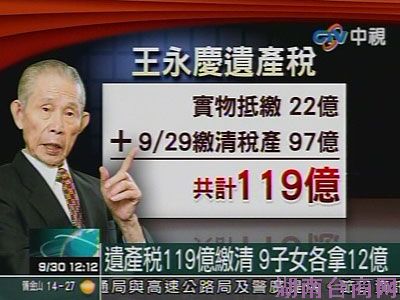 王永庆2008年10月突然过世,据指出,王永庆在岛内共留下595亿元的遗产,共需缴交119亿元的遗产税,其中,在去年9月有113亿元入帐,使得9月份的遗产税实征净额达133亿元,创下的史上单月新高纪录。另外6亿元的实物抵缴部分,也在11月由台当局“财政部国有财产局”完成土地变更为公有。119亿元的遗产税悉数上缴,如果再加上28亿元的赠与税,合计王家去年共缴交了147亿元的遗赠税。(冯江)