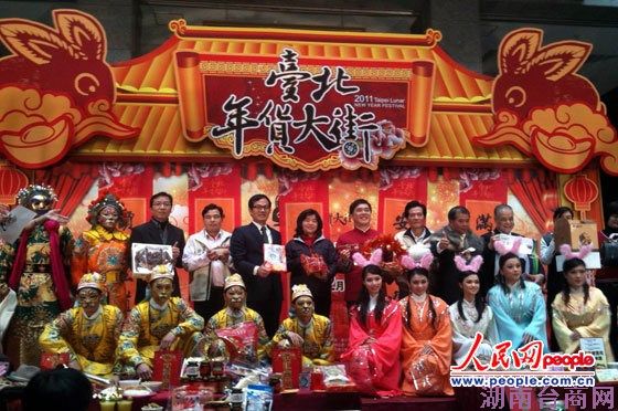 台北市年货大街将于1月15日热闹开卖。12日,台北市政府与六大商圈共同举行记者会,提出“价格公道”、“货源充足”、“亲子同乐”、“安全无虞”和“满载而归”五大保证,并展示丰富多彩的“好康(又好又便宜)”年货商品。图为台北市长郝龙斌与各大商圈代表展示特色年货。 来源:人民网
