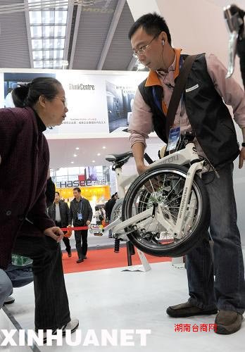 2009年11月18日,工作人员(右)向市民展示可折叠自行车。在高交会的台湾精品馆里,几秒钟就可以折叠的自行车、精美的法兰瓷等台湾精美工业品吸引众多市民前来参观选购。据了解,此次台湾共有38家企业携120件刚刚评选出来的台湾精品前来参展。新华社记者 卢汉欣 摄