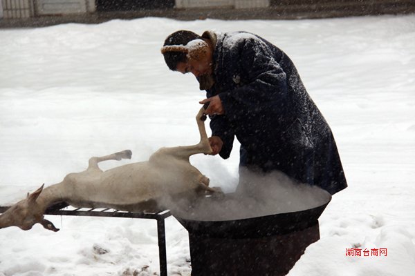 陈惟志是湖南省隆回县金石桥镇罗公湾村养羊专业户,为保证市场供应,1月19日,陈惟志冒着冰雪在宰杀山羊岀售。低温冰雪天气持续,隆回县委县政府积极应对,确保市场供应,蔬菜水果肉食水产货源充足。