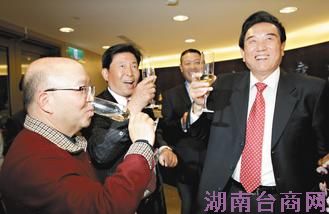 陈云林(右)夜访中国远洋企业驻台代表处,与中远企业董事长徐定心(左)及中远集团总裁魏家福(左二)共饮香槟。