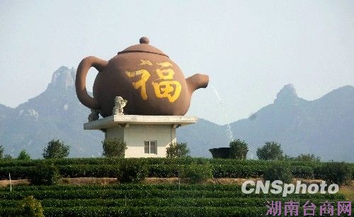 6月13日,一巨型茶壶树立在位于福建漳州的“世界茶王”台商李瑞河茶园内。有“世界茶王”之称的台商李瑞河是台湾南投人,20世纪90年代初来到漳浦创办天福茶庄,经营两岸茶业,目前在世界各地开有1008家直营店。 中新社发 王东明 摄