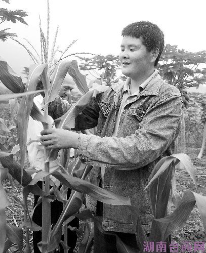 图为台商郑经润与员工正在查看台湾甜玉米的长势。