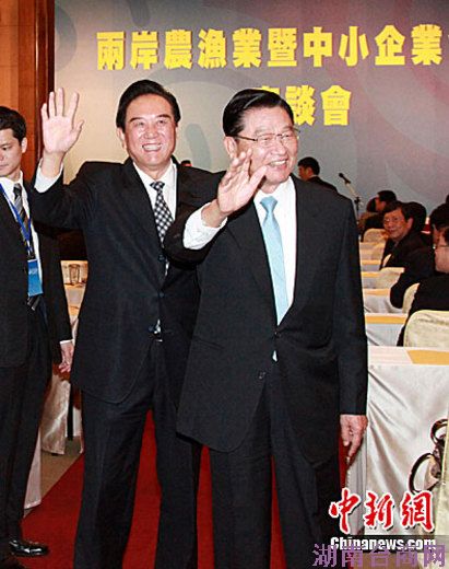 2月25日下午,正在台湾参访的海协会会长陈云林一行来到嘉义市,与台湾海基会董事长江丙坤及企业界人士共同出席两岸农渔业暨中小企业合作座谈会。图为陈云林(左)与江丙坤在会场向媒体记者打招呼。中新社记者 符永康 摄