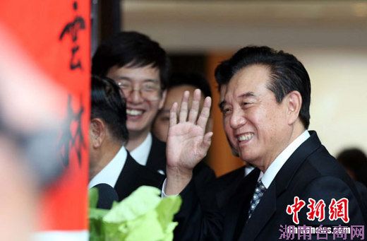 2月26日,海协会会长陈云林率经贸考察团来到台湾农业大县云林县参访,当地农会巧妙打出“云林欢迎陈云林”等条幅。图为陈云林在云林科技大学听取农产品登陆等相关介绍前,向记者挥手致意。中新社记者 董会峰 摄