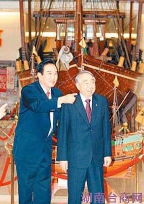 大陆海协会会长陈云林27日率领经贸访问团拜会长荣集团总裁张荣发并共进午餐,双方就两岸航运发展及合作交换意见。图为陈云林在张荣发引导下,参观中国近代第一艘铁骨木壳双层巡洋舰“开济号”模型。图片来源:台湾《中国时报》 中新网2月28日电 据台湾《中国时报》报道,预订28日晨搭机离台的大陆海协会会长陈云林一行,27日在台北市、新北市、桃园县来回穿梭,一早先到八里台北港参观,又赶赴桃园看自由贸易港,午间接受长荣集团总裁张荣发宴请后,随即到内湖科学园区,傍晚听取桃园县长吴志扬的招商简报。