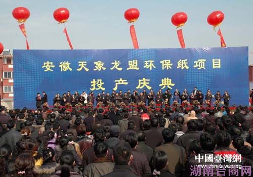 庆典仪式由淮北市市长牛弩韬主持,中共淮北市委书记、市人大常委会主任毕美家和杜集区委书记顾文致贺词,安徽省副省长黄海嵩宣布安徽天象龙盟环保纸项目正式投产。安徽天象龙盟环保纸项目淮北和台湾合作双方负责人孔令发、梁石辉分别介绍项目的合作、生产和产品情况。