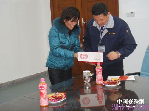 中国台湾网1月25日长沙消息 2011年春节将近,湖南省长沙县台办全体干部职工逐个走访、慰问重点台资企业,并送上春节贺卡及慰问金。图为元月25日走访台企长沙镁镁科技有限公司。左为长沙县台办主任李红军,右为长沙县重点台商、长沙镁镁科技有限公司董事长苏国课。(中国台湾网、长沙县台办联合报道)