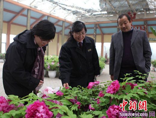 洛阳出入境检验检疫局工作人员正在对参展牡丹生长情况进行观察。