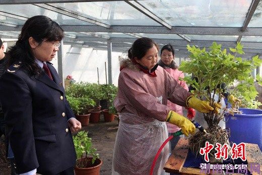 洛阳神州牡丹园职工正在洛阳出入境检验检疫局检疫人员监督下,对参展牡丹进行根部清洗、消毒。