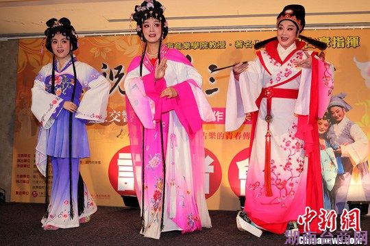 福建南音及歌仔戏经典曲目《陈三五娘》融入交响乐等元素,首度赴台巡演。图为3月14日,来自厦门的3位名角在台北记者会表演精彩片段,惊艳全场。中新社发 董会峰 摄