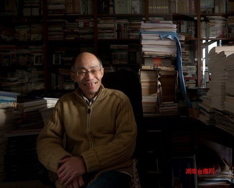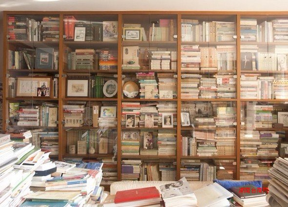 书堆得太多,已经占满了整个客厅,陈子善只能缩在一张小桌子上的一个角落工作