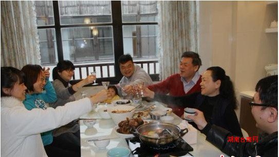 登上二楼餐厅,只见炉火正旺,火锅里肉菜飘香。“来、来,请坐,一起喝杯酒!”餐厅中间摆放着一只特大的长方型桌子,翁先生全家人正在围炉吃年饭,一见来了客人,连忙起身让坐。