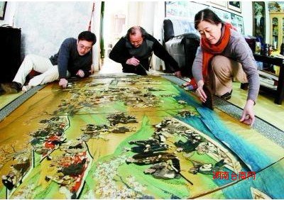 全家齐上阵修复古屏风。正是由于邵晓铮(右一)对中国传统刺绣工艺的多年研究,使得她在从事织绣文物的复制和修复时也游刃有余。