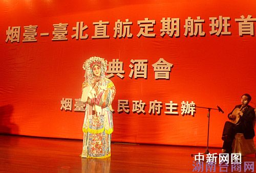 2月2日晚,烟台——台北直航定期航班首航成功庆典酒会在台北圆山饭店举行。图为山东的文艺团体在庆典酒会上表演京剧 作 者:陈立宇