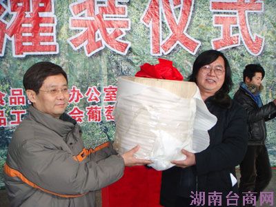 中国食品工业协会葡萄酒专家委员会秘书长杨强和大东副食品商场总经理王德芙两人共同捧起410毫米的橡木瓶塞