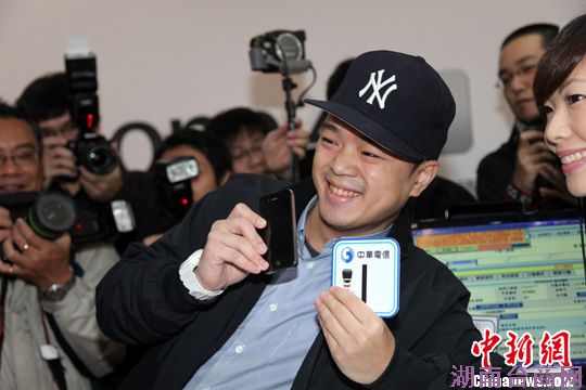 图为台北信义区威秀首卖会,凌晨便排队、拟购机送给妈妈生日礼物的许先生拔得头筹,率先在中华电信门市拿到一部iPhone 4S,吸引大批记者拍摄。中新社记者 董会峰 摄