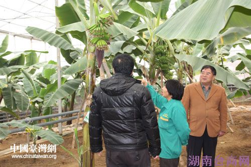 温室大棚中,工作人员正在讲解香蕉的生长过程。(中国台湾网 王君飞 摄)