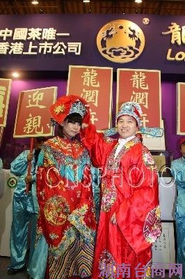 12月16日,大陆唯一在香港上市的茶叶公司龙润茶集团与台湾双文堂合作,携手参加2011台湾茶艺博览会。图为龙润茶集团副总裁杨贵良(右)与台湾女演员扮成新郎、新娘,在台北以古礼迎亲的方式拉抬买气。