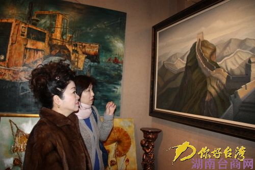 台湾嘉宾认真欣赏大陆油画作品(你好台湾网 何姝寰 摄)