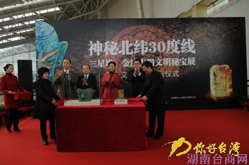 三星堆博物馆副馆长朱亚蓉、金沙遗址博物馆副馆长朱章义揭幕展示赴台文物青铜人面像和四节玉琮(你好台湾网 图)