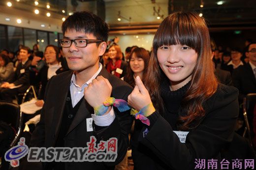 两位分别来自上海理工大学与台湾大学参加此次“两岸大学生精英交流营”的大学生一起秀出了象征两岸大学生友谊长存的七彩手带。