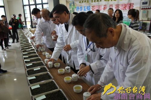 “斗茶”比赛经两岸6名茶茶业专家评审(大陆和台湾各3人),几名评茶师站成一排,端起面前的茶杯,闻了闻,用嘴抿了一口杯中茶,若有所得,然后将茶吐到小碗中,接着又端起下一个茶杯……如此循环进行,在评茶师尝过200多个茶样后,新晋“茶王”诞生了。