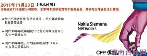 昨日,诺基亚与西门子的网络设备合资公司诺基亚西门子通信公司(以下简称“诺西”)宣布,计划在2013年年底前全球裁员17000人,将移动宽带和服务作为战略重点,并在全球范围内实施大规模重组。