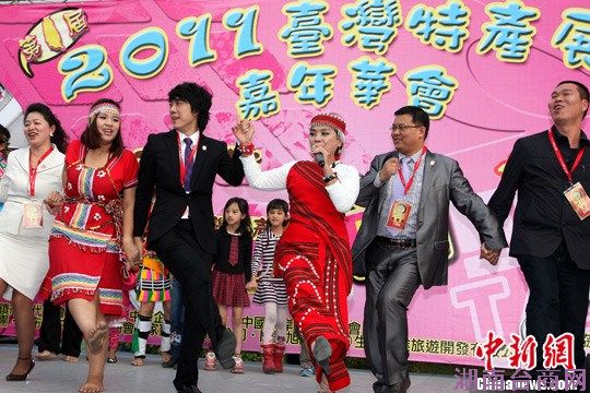 12月4日,“2011台湾特产展售嘉年华会”在台中公园举行,来台参加“两岸企业领袖创富交流”的大陆企业家受邀登台,与少数民族表演者和台湾民众载歌载舞,其乐融融、场面热烈。中新社发 董会峰 摄