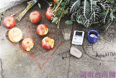 “果粉”摆上祭奠的苹果,几乎每一个都被咬掉一口。