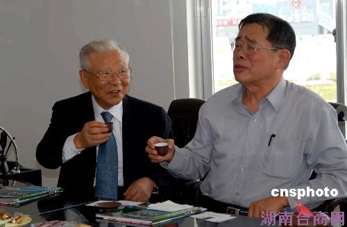图为许历农(左)在天福茶博物院与天福集团总裁李瑞河品茗交谈。
