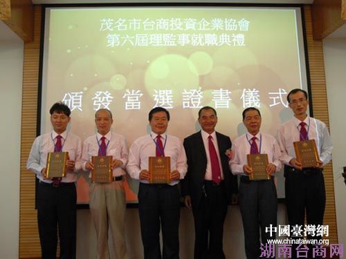 中国台湾网10月21日茂名消息 日前,广东茂名市台商投资企业协会举办第六届理事监事就职典礼,茂名放鸡岛海洋公园董事长陈明哲连任会长。广东省台办陈国兴主任、茂名市政协副主席、统战部长邱淑英、茂名市台办主任刘国珍等领导到会祝贺。