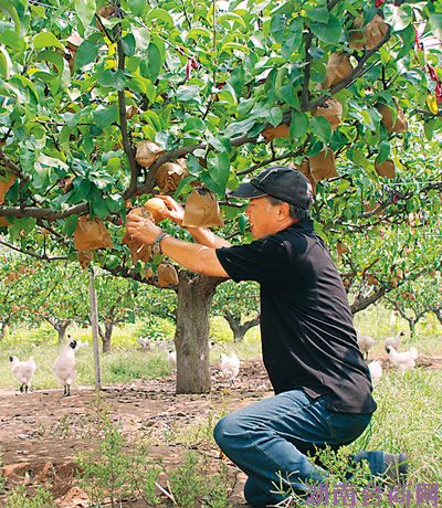 老张还利用生物克制来实现驱鸟防虫,为的是不使用哪怕一丁点儿农药,虽然在成果率上不如洒农药的效果好。老张说:“我种的是梨,但修的是身,养的是性。”
