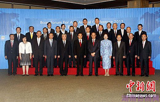 4月15日,国家主席胡锦涛出席博鳌亚洲论坛2011年年会,并与出席会议的两岸企业家代表合影。中新社发 张宇 摄