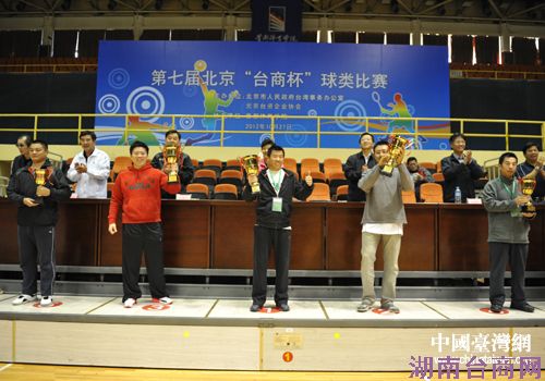 中国台湾网10月29日北京消息 10月27日,第七届“台商杯”球类比赛在首都体育学院的北京大学生体育馆举行,来自北京市及各区县台办、在京台资企业以及高校的38支代表队共300余名业余运动爱好者参赛。北京市台办主任马玉萍,副主任王兰栋、高振生,副巡视员杜德平、马振生,北京台协理事长林清发等出席开幕式和闭幕式。