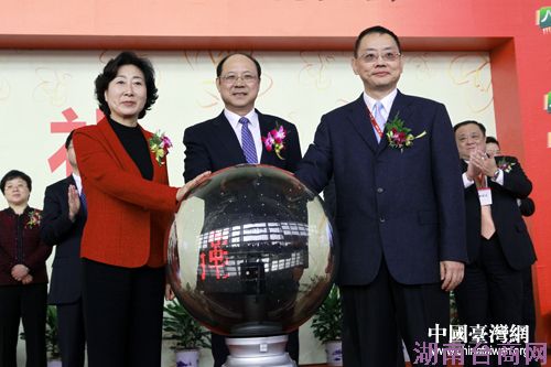 由国务院台办与安徽省人民政府主办的首届海峡两岸电子信息博览会29日上午在马鞍山市开幕。国台办常务副主任郑立中(中)、安徽省副省长花建慧(左)、台湾电电公会理事长焦佑钧(右)共同启动开幕式水晶球。(中国台湾网 王伟 摄)