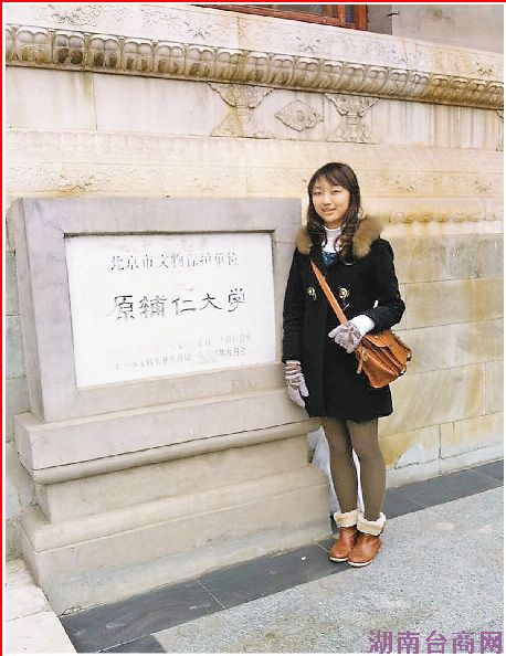 夏嘉翎在北京原辅仁大学碑前留影。图片来源:台湾《旺报》