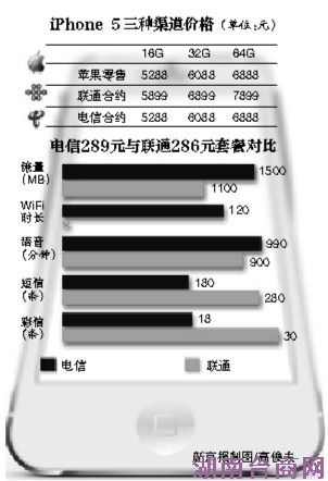 以电信289元与联通286元三年期零元购机档为例,电信包含1500M流量,联通包含1100M流量,电信版iPhone5套餐中所包含的流量高于联通版36%。而在语音通话方面,电信版套餐也比联通版套餐里的语音通话时间长了90分钟。