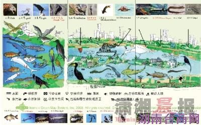 上图展示的是湘江长沙段生态绿地图。绿地图即用一套世界通用的图示,在地图上清楚地标示出某个地方与我们日常生活息息相关的生态与文化景点。