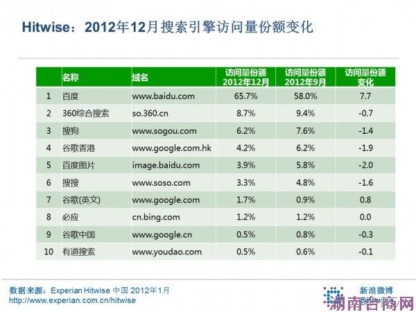 据第三方互联网数据服务机构Hitwise日前发布数据显示,相比2012年9月,百度访问量份额为65.7%;上升7.7个百分点;360搜索仍稳定在第2位,访问量份额为8.7%,下降0.7个百分点。