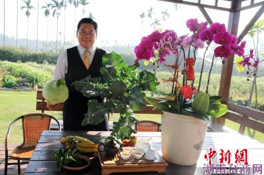 2月15日,原矿家有机农法首席执行官、台湾鹏景集团董事长王仲鹏在南投县名间乡的农舍向记者展示刚从田园采摘,用原矿家有机农法种植的高丽菜等蔬菜。