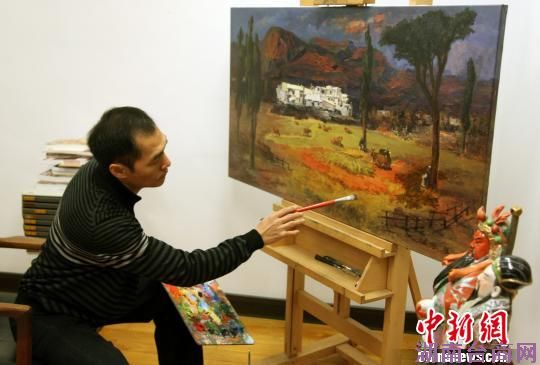 图为高雄画家杨腾集在创作。 陈立宇 摄