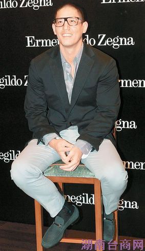 蒋友柏为Zegna设计蛇年创意橱窗揭幕,难得以上蓝下白的义式搭配亮相。图片来源:台湾《中国时报》