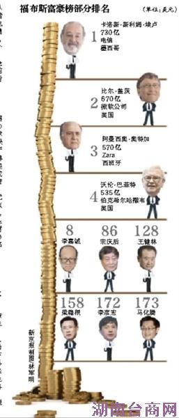 榜单显示,墨西哥电信大亨卡洛斯·斯利姆以730亿美元连续第四年蝉联全球首富的桂冠。比尔·盖茨保住了第二把交椅,其净资产达到670亿美元。时尚品牌Zara的创始人阿曼西奥·奥特加排名较去年跃升两位成为全球第三大富豪,其净资产达到570亿美元。