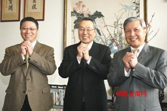 宏碁昨天开工,董事长王振堂(右)与纬创董事长林宪铭(左)到宏碁创办人施振荣(中)家中拜年