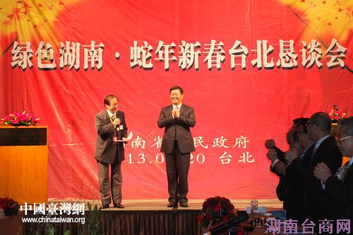 中国台湾网3月1日台北消息 日前,受台湾工商建研会邀请,由湖南省人民政府主办,湖南省台办、省商务厅、省旅游局承办的“绿色湖南·蛇年新春台北恳谈会”在台北举行。活动共邀请到台湾工商建研会、工业总会、商业总会、东元集团、南良集团、大润发集团、中视集团、TVBS等台湾商协会、工业企业、商业企业及传媒业代表共计90余人出席。湖南省人民政府副省长何报翔、湖南省直有关部门及长沙、湘潭、衡阳、邵阳四市人民政府负责人参加了恳谈会。