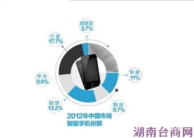 在三星之后,中国智能手机市场以份额计算排名二至五位的依次是联想(市场份额13.2%)、苹果(11%)、华为(9.9%)和酷派(9.7%)。