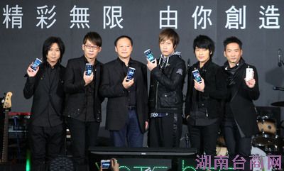 HTC的CEO周永明(左3)和新HTC one代言人五月天。图自台湾“中央社”