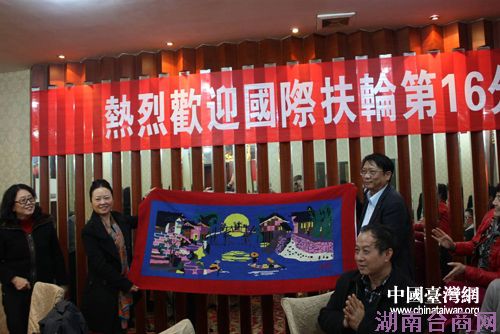 台湾嘉宾向湘西州人民政府副州长向清平女士回赠纪念品。(图片来源:凤凰县台办)